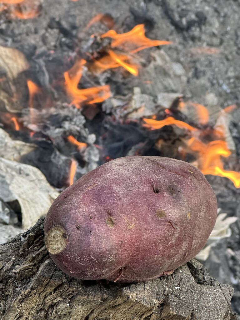 畑に集めた枯れ葉や枯れ枝で「焼き芋」も美味しい